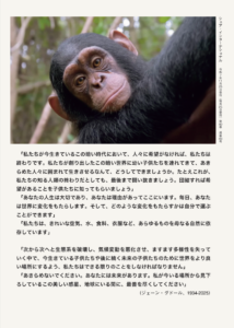 「行動を起こし、私たちには物事を変えることができると認識するのは大切なことです。それが他の人々の行動を促し、私たちは独りではなく、私たちの行動がさらに物事を変えていくことを知ることにつながります」――ジェーン・グドール(霊長類学者、自然保護活動家、人道主義者、国連平和大使)